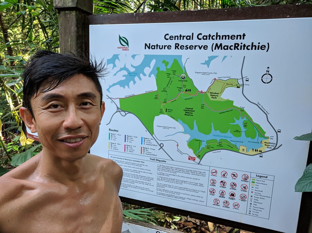 Turn left to enter the MacRitchie Trail at the exit for the 4.8KM cross country running route. You should see this sign. Study the map carefully if you are not familiar with the area, you will want to find the route that heads towards the ranger station.